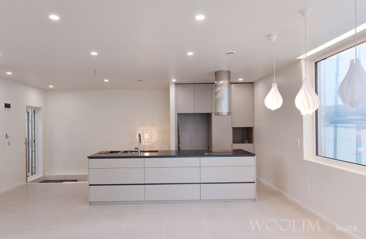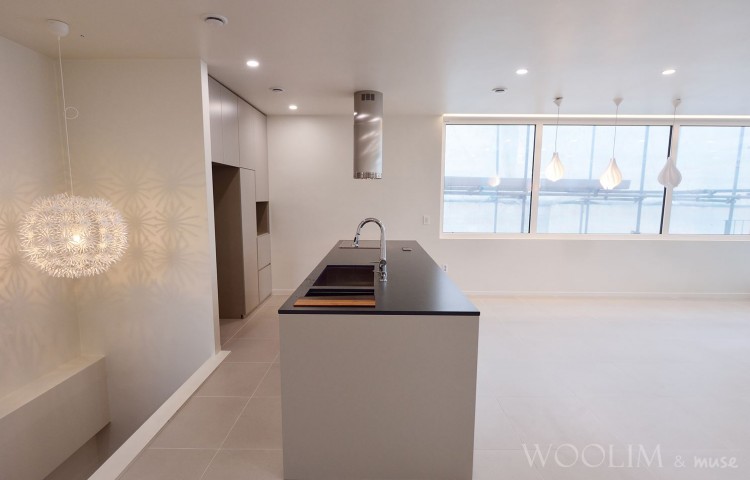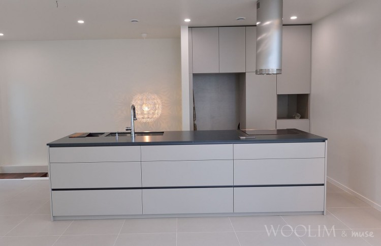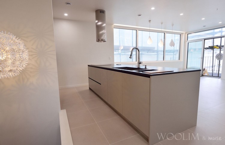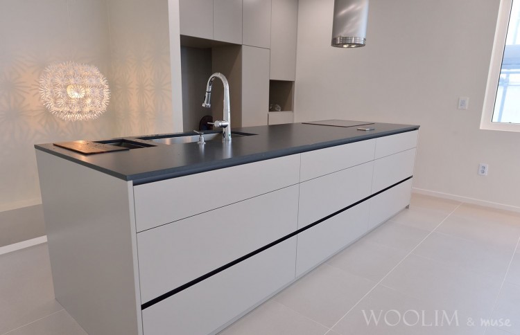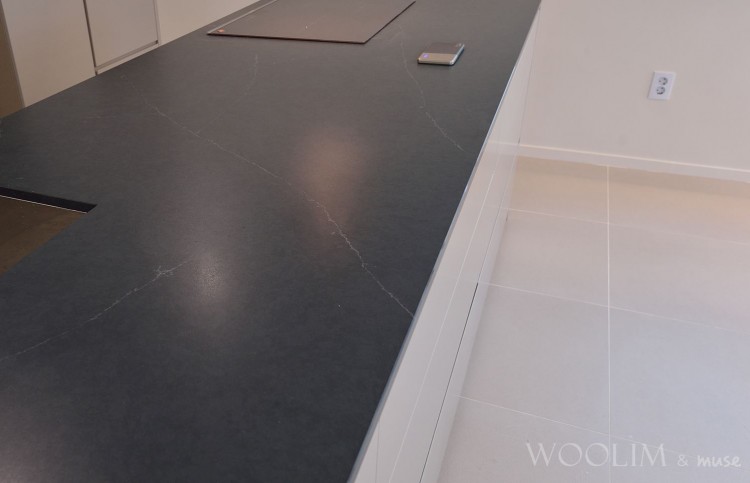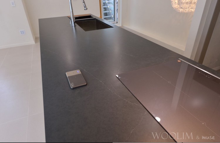 이번 현장은 11자 구조로 도어는 우레탄 도장이며, 상판은 스페인에서 수입된 사일스톤_엔지니어스톤중 하나이며