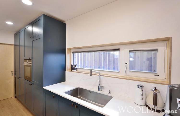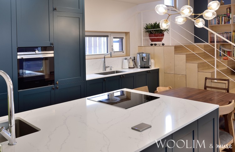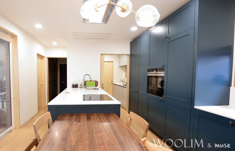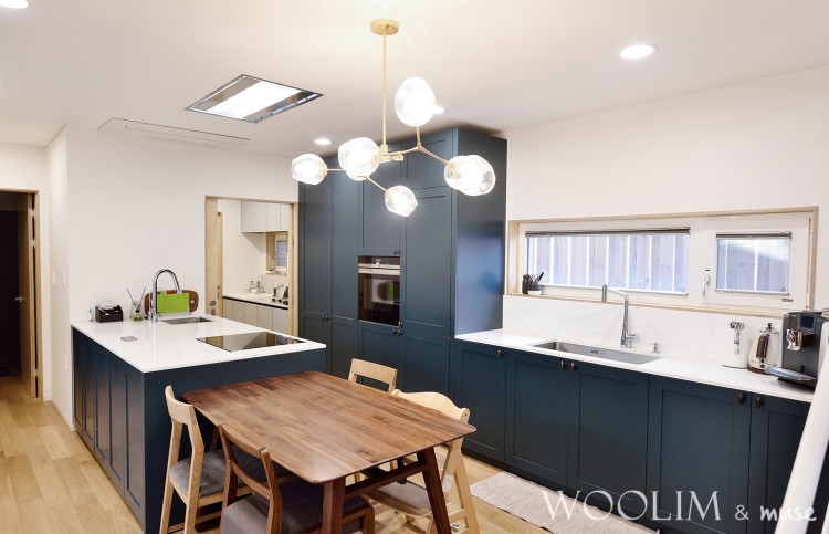 11자 주방구조이며 씽크볼은 벽쪽으로 아일랜드에는 인덕션 그 옆으로 식탁이 배치된 구조입니다.